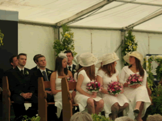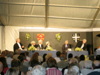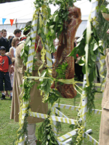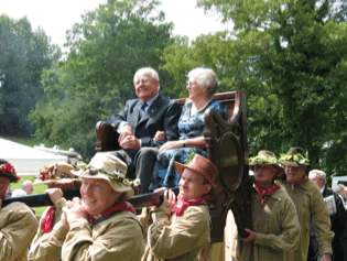 The claimants are tried in public by celebrity ‘barristers’ – one group as counsel for the defendants and the other for ’the bacon’. The counsels have included actors, MPs, radio presenters and the very popular Clare Rayner. Much embarrassing detail about the claimants’ marriage can usually be expected! The counsels for the claimants and for the Bacon. The jury consisting of 6 maidens and 6 bachelors, make the decision as to whether to award the flitch to the claimants based on the arguments presented by the learned counsel. The jury of maidens and bachelors. The successful claimants are carried in the ceremonial chair (now replaced with a modern replica) from the trial tent to the Market Place where the oath is taken in front of the judge, jury and assembled public. The sentence is then passed on the couple. The successful coupleare carried to the oath-taking ceremony The oath-taking ceremony outside the Starr Restaurant Several couples are tried each year and the trials are spread out over a whole day – one in the morning and two in the evening. The winning couples are presented with a flitch of bacon, and the unsuccessful claimants are awarded a gammon. The Flitch as awarded to the successful claimants.