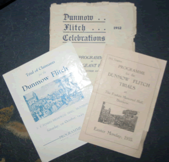 A selection of early Flitch Trial programmes. The flitch being carried in procession to Talberds Ley in the 2004 trials.