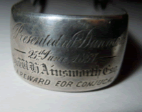 David Ogbournes engraving of the 1751 Flitch Trial ceremony After a century, the ceremony was revived by Harrison Ainworth, the Victorian author who had written a novel entitled ‘The Flitch of Bacon or the Custom of Dunmow; A tale of English Home’ in 1854. He decided to award a flitch to a deserving married couple who were prepared to be ‘tried’ by a judge and jury, at a ceremony in the Town Hall on 19 July 1855. This occasion proved to be a great success and was repeated in 1857 on 25 June. Harrison Ainsworth himself was the judge at both these trials. Only one flitch was awarded but two couples were tried, so the unsuccessful couple were awarded a ‘silver ornament’ (a pair of inscribed sugar tongs shown in the photos below).