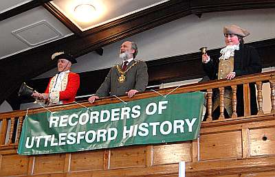 The Mayor of Saffron Walden, Cllr Mike Hibbs opening the Uttlesford History Fair, held at Saffron Walden Town Hall on 28 March 2009. The mayor emphasised the importance of history in promoting a sense of community, and how strong it was in Saffron Walden. He was accompanied by the Town Crier for the day, Peter Riding and his assistant, 11-year-old James Lowe.