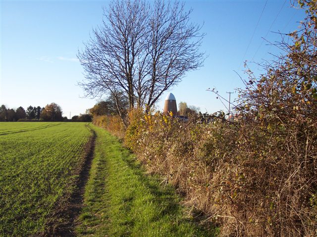 Path showing one of the two surviving sail-less windmills in Clavering |